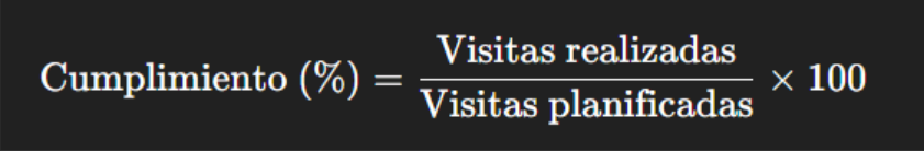| Cumplimiento de visitas | Visitas ejecutadas vs. planificadas | Realizadas / Planificadas × 100 | Disciplina comercial y cobertura del territorio | > 90% |