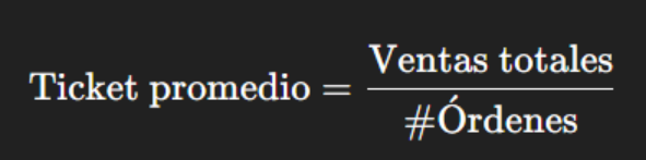 | Ticket promedio | Promedio de venta por orden | Ventas / Órdenes | Evalúa mezcla de productos y ventas incrementales | Depende del sector |