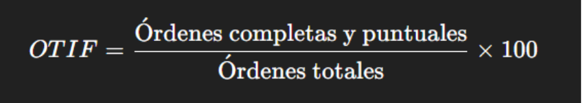 | OTIF | Cumplimiento logístico (entregas completas y puntuales) | Entregas completas y puntuales / Total × 100 | Impacta recompra y satisfacción del cliente | > 95% |