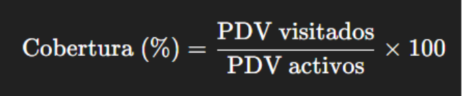 | Cobertura | Puntos de venta visitados vs. activos | Visitados / Activos × 100 | Asegura presencia en el mercado | > 80% |