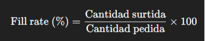| Fill rate | Porcentaje del pedido surtido | Surtido / Pedido × 100 | Evita pérdidas por quiebres | > 92% |