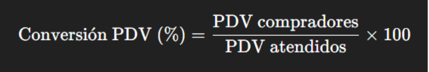 | Conversión PDV | PDV compradores vs. atendidos | Compradores / Atendidos × 100 | Mide calidad de ejecución comercial | > 70% |